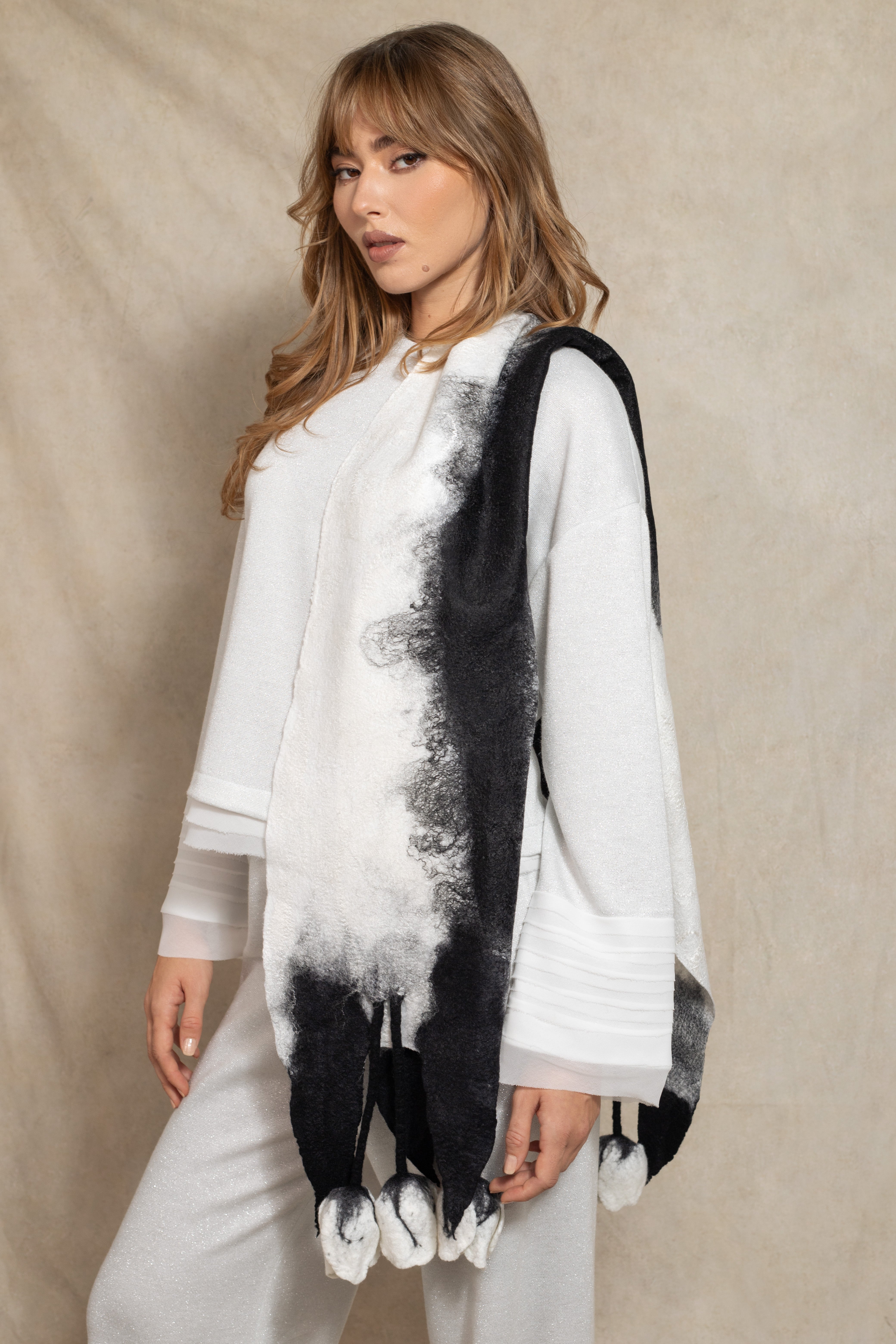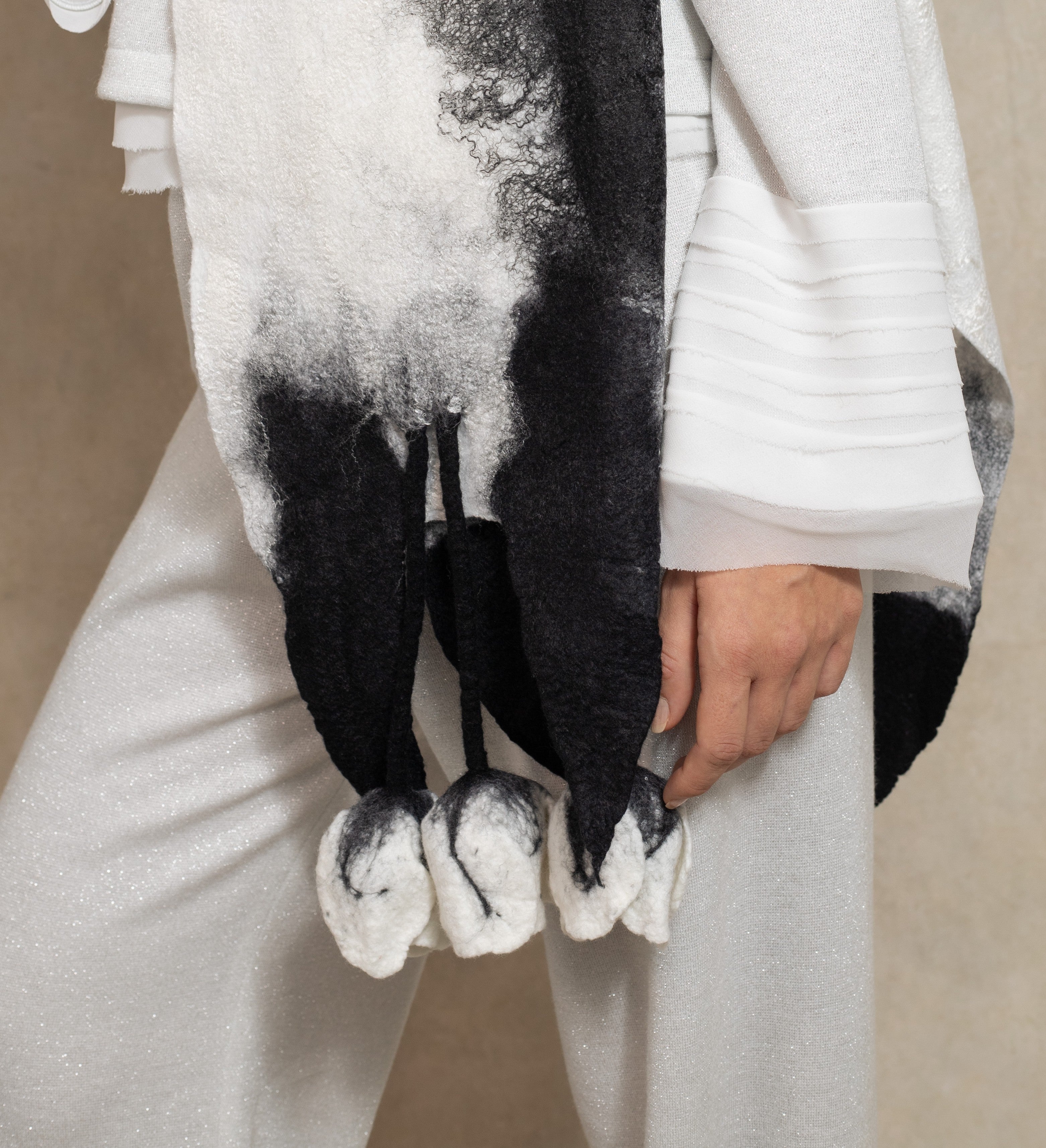 Der Schwarz-weißer Tulpen-Schal aus der Herbst-/Winterkollektion 2025 von Demi kombiniert kontrastierende Farbtöne für einen auffälligen und dennoch raffinierten Effekt. Schwarze Tulpenmotive ragen durch die Nuno-Filztechnik aus einem weißen Untergrund hervor und schaffen ein limitiertes, vollständig handgefertigtes Designerstück, das exklusiv bei Demi erhältlich ist. Weiche Merinowolle, Seide und Viskosefasern sorgen für eine luxuriöse Textur, die sich perfekt für Lagenlooks oder auffällige Stylings eignet.