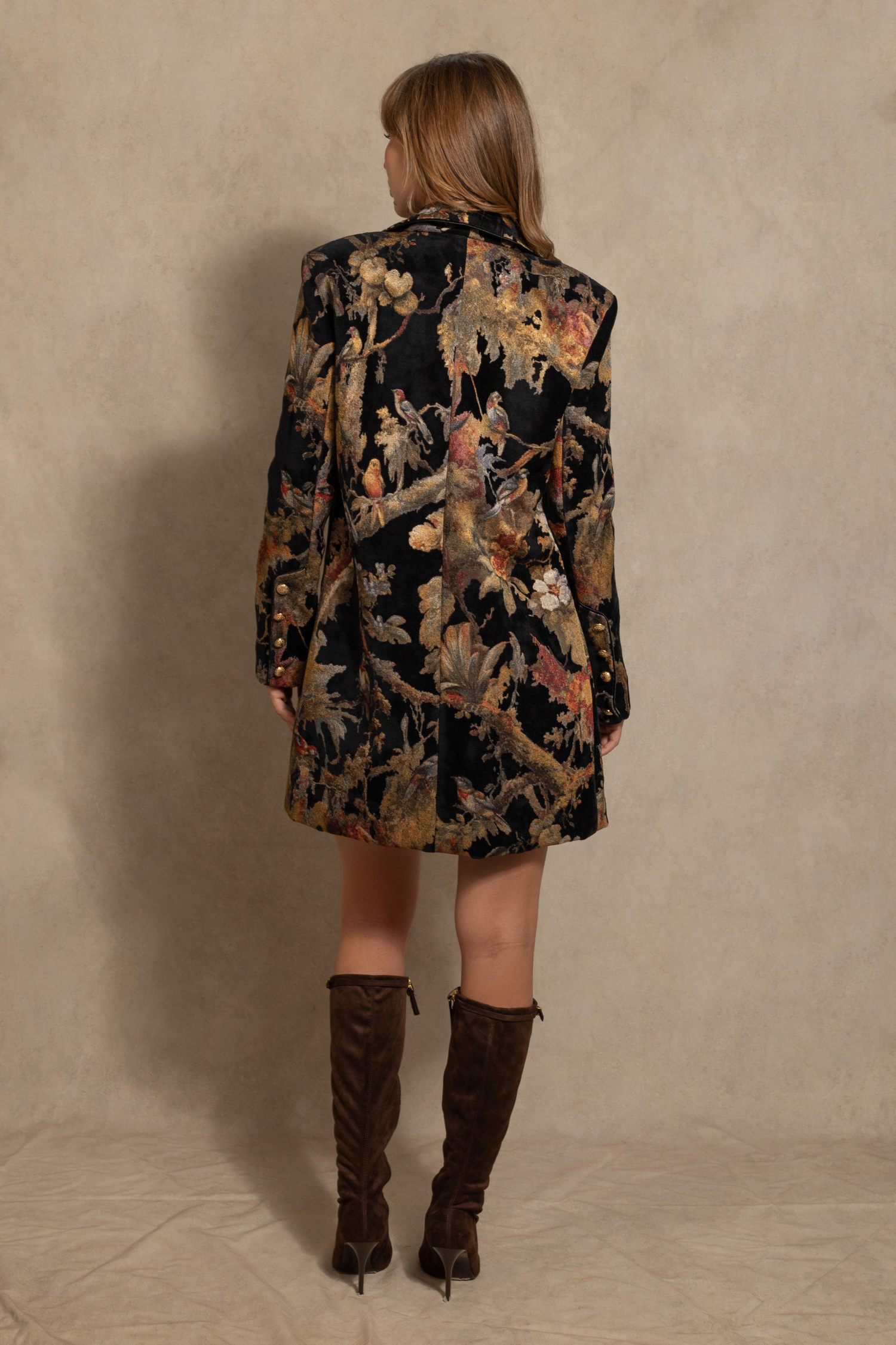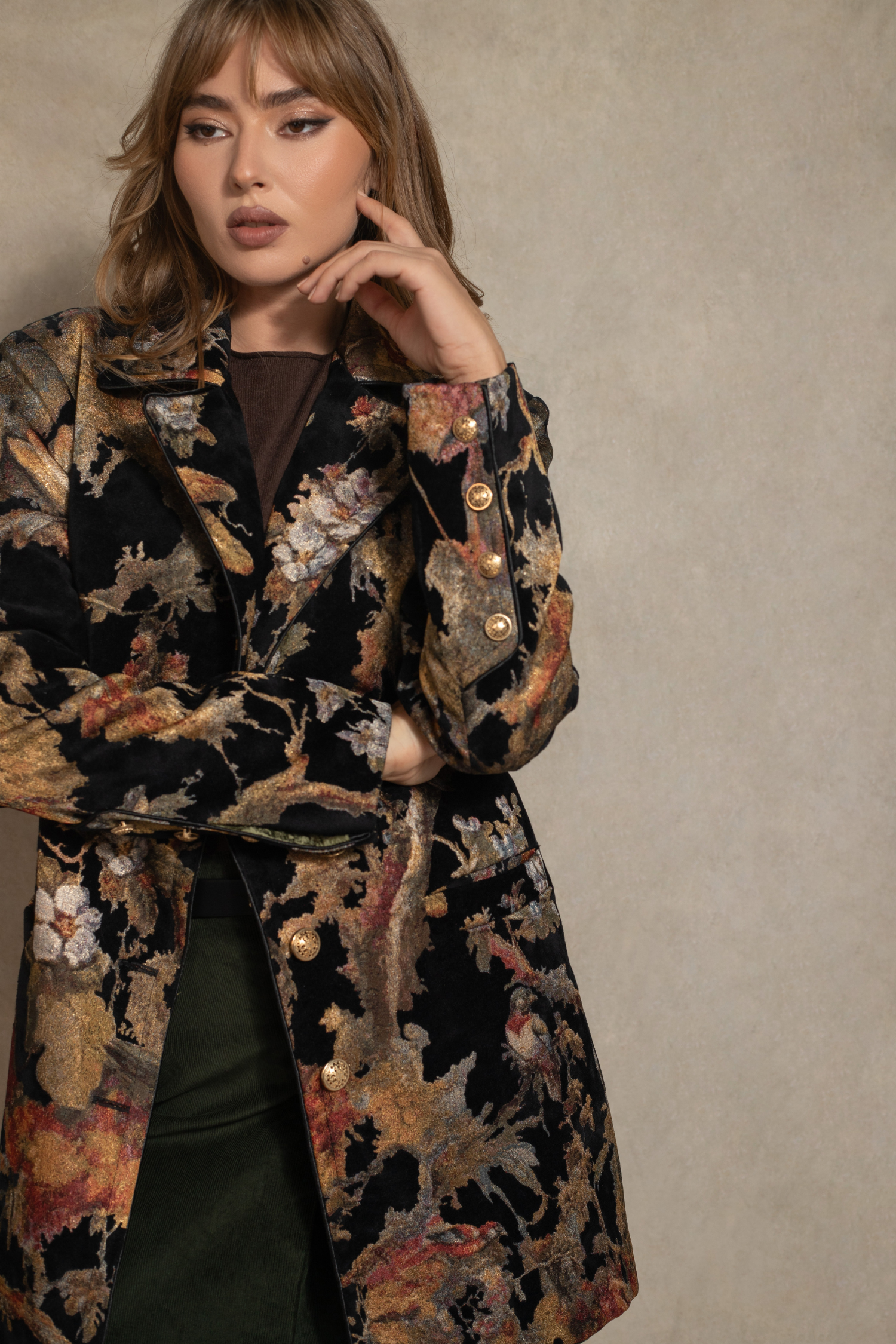 Der Birdy Coat aus der Herbst/Winter-Kollektion 2025 von Demi verkörpert die Essenz moderner Eleganz und verbindet architektonische Präzision mit zurückhaltendem Luxus. Die gerade Silhouette und der spitze Kragen sorgen für eine raffinierte Struktur, während der Jacquard-Samtstoff eine reichhaltige haptische Note hinzufügt. Strukturierte Vogel- und Blattmotive zieren dezent die Oberfläche und erinnern an die Ruhe und Tiefe der Herbstlandschaft.